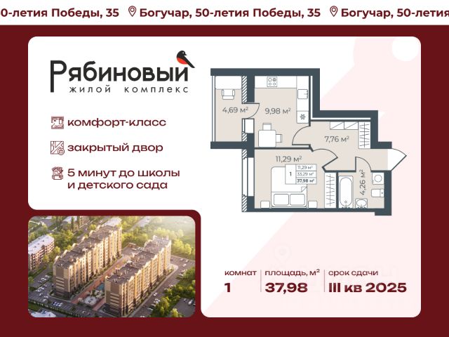 Время выбирать — столичный комфорт прямо в Богучаре! Жилой "Рябиновый" состоит из двух кирпичных домов, один из которых сдается уже осенью 2025 года. Закрытая дворовая территория обеспечивает безопасное пространство для отдыха детей и взрослых, а дети всех возрастов найдут себе занятие по душе на лучшей детской площадке в городе. Дворы и входные группы расположены на одном уровне — нет ступенек, пандусов и лишних препятствий, что позволяет без труда передвигаться маленьким жителям жилого комплекса, их родителям с колясками и пожилым людям. Чистые и светлые подъезды с дизайнерским ремонтом создают приятное впечатление с порога. Для удобства жителей предусмотрены помещения для хранения велосипедов, колясок и спортинвентаря. В каждом подъезде расположены по 2 лифта. Каждая планировка — для жизни. Все площади используются максимально эффективно, в квартирах есть: просторные кухни и гостиные, ниши для шкафов, просторные коридоры, гардеробные и постирочные комнаты. Все квартиры сдаются в улучшенной базовой отделке, которая включает в себя полусухую стяжку, гипсовую штукатурку и разводку электрики. Есть возможность заказать отделку "стандарт" и "премиум", а платеж легко оформить в ипотеку. Оба варианта включают полный набор для комфортного старта: сантехника в санузлах и на кухне, розетки и выключатели, натяжные потолки и межкомнатные двери. В "стандарте" — практичный линолеум и обои, в "премиуме" — стильный ламинат и обои под покраску. Жилой комплекс "Рябиновый" прекрасно подойдет для тех, кто предпочитает сочетание комфорта и технологичности современной квартиры с уютом природы и небольшого города вокруг. Адрес: г. Богучар (Воронежская область) Высота: 9 этажей Квартиры: 186 квартир в первой очереди Материал: кирпич Площадь: 9 779 кв.м жилья в первой очереди