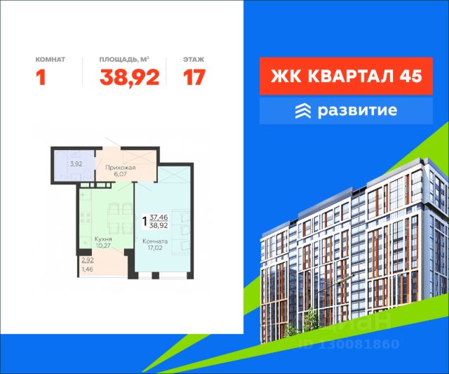 В продаже квартира площадью 37.62 кв. м с черновой отделкой. Квартира расположена на 14 этаже 18 этажного дома, в жилом комплексе комфорт-класса "Квартал 45". "Квартал 45" - это амбициозный проект будущего сердца Московского проспекта, в котором объединены лучшие градостроительные традиции, уникальная архитектура и современные технологии дизайна. Удачная локация рядом с центром, функциональные планировки, приватный парк в шаге от дома, собственный подземный паркинг на 187 машино-мест. Проект от федерального застройщика "Развитие" сочетает в себе все преимущества современного комфортного жилья. Расположение Пешком: - 3 мин. до остановки "Московский проспект"; - 5 мин. до Центрального автовокзала; - 15 мин. до уютного Коминтерновского сквера. На автомобиле: - 10 мин. до центра Воронежа; - 10 мин. до Ботанического сада; - 15 мин. до Петровской набережной. Благоустройство - приватный двор для жителей; - безопасность: нет машин, работают видеокамеры; - много зелени: деревья, кустарники, газоны; - тихие места для отдыха на свежем воздухе; - спортивный корт для командных игр; - силовые тренажеры и турники; - игровой городок для детей всех возрастов; - лужайки для пикников; - велосипедные и беговые дорожки; - длинный прогулочный бульвар; - просторный холл с авторским дизайном; - 2 лифта в каждом подъезде - грузовой и пассажирский; - удобные зоны хранения колясок и спортивного инвентаря; - кафе, продуктовые магазины, салоны красоты и другая инфраструктура на первом этаже дома. Окружение - 5 парков в пределах 10 минут: Центральный парк, Ботанический сад ВГУ, Лесопарковый участок НИИЛГиС, парк Победы, Северный лес; - спорткомплекс и стадион "Динамо", "Арена Север", Центральный стадион профсоюзов; - детская и взрослая областная больница, несколько частных клиник; - ТРЦ "Московский проспект", ТЦ "Москва", множество сетевых супермаркетов.