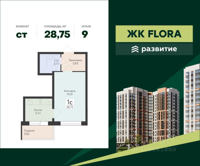 В продаже квартира площадью 28.75 кв. м с черновой отделкой. Квартира расположена на 9 этаже 17 этажного дома, в жилом комплексе комфорт-класса FLORA ("Флора"). ЖК FLORA - лучшие условия для жизни в одном из самых привлекательных и зелёных районов города. Проект от федерального застройщика ГК "Развитие" состоит из семи секций переменной этажности и также включает в себя мультифункциональные площадки для всех видов отдыха, собственное ритейл-пространство, 270 парковочных мест для автомобилей, множество продуманных планировок. Жизнь в идеальном балансе между природой и современным городом - жизнь в ЖК FLORA! Расположение Пешком: - 8 мин. до остановки "Институт генетики"; - 10 мин. до Дендрария; - 12 мин. до школы "Содружество" на 2860 учеников. На автомобиле: - 5 мин. до Московского проспекта; - 8 мин. до ВГАУ им. Петра I; - 15 мин. до пляжа у реки Воронеж; - 20 мин. до центра города. Благоустройство - двор, разделенный на функциональные пространства; - игровые комплексы для детей; - безопасное покрытие, защищающее от травм; - зона-воркаут; - тренажеры для силовых и кардио-тренировок; - велодорожки; - протяженная прогулочная аллея; - скамьи и беседки для отдыха; - ландшафтное озеленение; - освещение двора в вечерние часы; - просторный холл с уютным интерьером; - колясочные и кладовые; - лапомойки для собак; - система охраны и видеонаблюдения; - супермаркеты, пункты выдачи, кафе и пекарни прямо в доме. Окружение - центральные ВУЗы, большая школа, десятки детских садов и учреждений доп. образования; - памятник природы "Старовозрастные Дубравы", лесопарк НИИЛГиС, Ботанический сад ВГУ, Северный лес, парк имени К. Д. Глинки; - ТЦ "Московский проспект", стадион "Динамо", гипермаркеты "Лента", "Магнит"; - пляж у Воронежского водохранилища, Археологический музей, кинотеатр Star&Mlad, культурно-досуговый центр "Северный".