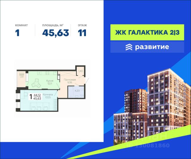 В продаже квартира площадью 42.77 кв. м с черновой отделкой. Квартира расположена на 11 этаже 21 этажного дома, в жилом комплексе комфорт-класса "Галактика 2|3". "Галактика 2|3" - это современный квартал нового поколения, где есть все городские удобства, дополненные локациями для активного отдыха, а главное -близостью к природе. Здесь вас будут ждать уютные квартиры с панорамными балконами и большие дворы с детскими площадками. Проект реализован группой компаний "Развитие" - один из крупнейших девелоперов Воронежской области, занимающий лидирующую позицию среди застройщиков по объему текущего строительства. Расположение Пешком: - 5 мин. до улицы Независимости; - 5 мин. до остановки "СКС Лада"; - 15 мин. до Северного леса; - 20 мин. до ТРК "Арена". На автомобиле: - 5 мин. до трассы на ул. Антонова-Овсеенко; - 10 мин. до Московского проспекта; - 15 мин. до Центрального парка; - 20 мин. до набережной Максима Горького. Благоустройство - двор, разделенный на функциональные зоны; - ландшафтное озеленение; - тихие уголки для отдыха; - скамьи и садовая мебель; - каменные дорожки для прогулок; - велосипедные и беговые дорожки; - большой игровой кластер для подростков; - активная площадка для малышей; - workout-тренажеры; - безопасное мягкое покрытие; - освещение в темное время суток; - большая открытая парковка; - кладовые для хранения велосипедов или лыж; - коммерческие офисы с ресторанами, магазинами и кафе. Окружение - жизнь по соседству с природой: Северный лес, озёра Бычок, Северск и Круглое, Фигурная роща, река Дон; - спортивные объекты: спорткомплекс "Арена Север", стадионы "Воронеж-Ринг", "Мир футбола", "Атлант", конный клуб "Старица", "Олимпик", ТРЦ Сити-парк "ГРАД"; - культурный отдых: музей ВДВ в парке Победы, Археологический музей, культурный центр "Северный"; - ТРЦ "Арена", "Московский проспект", школы, детские сады, супермаркеты.