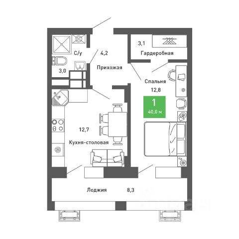 Квартира: 1 к 40,09 кв.м., 13 этаж в комплексе Z-town, 1 очередь, корп.1, сдача: 2кв. , этажей: 21, адрес Воронеж г., Чуева наб., д. 7, Застройщик: Новый код.