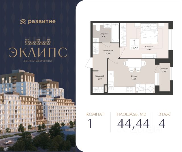 В жилом доме, расположенном в историческом центре на первой линии реки Воронеж, продается 1-комнатная квартира площадью 44.44 кв. м с черновой отделкой. Квартира расположена на 4 этаже жилого дома бизнес-класса "Эклипс" от федерального застройщика ГК "Развитие". "Эклипс" - жилой дом бизнес-класса с выразительной архитектурой, видовыми квартирами и благоустроенным двором-парком. Здесь динамика центра города сочетается с природным окружением, технологичностью и высоким уровнем комфорта. Это место, где можно жить в ритме города, не теряя внутреннего равновесия. Расположение Пешком: - 1 минута - набережная Массалитинова; - 5 минут - ж/д станция "Центральный парк"; - 10 минут - Парк "Дельфин", Парк "Алые Паруса"; - 10 минут - ВГАУ; - 20 минут - Парк Динамо. На автомобиле: - 5 минут - улица Степана Разина, проспект Революции; - 5 минут - Северный мост, Чернавский мост. Лобби - колясочная; - место для хранения велосипедов; - просторная входная группа с витражным остеклением; - грузовые и пассажирские лифты с возможностью спуска в подземный паркинг на 174 машиноместа; - зоны ожидания с мебелью. Благоустройство - Двор закрыт от прохожих и транспорта; - Ландшафтный дизайн; - Места для отдыха с шезлонгами и скамейками; - Навигационная подсветка прогулочных дорожек для темного времени суток; - Собственная инфраструктура (важные магазины и сервисы) на первом этаже здания; - Круглосуточное видеонаблюдение; - Доступ на внутреннюю территорию и в парадные по ключам или Face ID. Окружение - Гостевые парковочные места; - Парки "Алые Паруса", "Динамо", "Дельфин"; - Петровская набережная и прогулочные маршруты вдоль реки; - Учебные заведения: школы, детсады, лицей, ВУЗы; - Торговый центр "Петровский пассаж", магазины, кафе, фитнес-клубы; - Кафедральный собор, музей Крамского. О застройщике Федеральный застройщик ГК "Развитие" лидирует по количеству возводимых объектов и входит в ТОП-20 девелоперов России. За 14 лет на рынке компания ввела в эксплуатацию свыше 1.3 млн кв. м жилья, еще столько же находится в стадии строительства. В портфеле - 30 завершенных проектов и более десятка тысяч заселенных квартир. Девелопер сотрудничает с ведущими отраслевыми партнерами, включая "Северсталь" и "Технониколь". "Развитие" специализируется на строительстве жилых комплексов и микрорайонов, развитии инфраструктуры и создании комфортной городской среды. Девелопер реализует проекты в Воронеже, Москве и области, Ленинградской области, Крыму, Орле и Самаре. Основные форматы - ЖК комфорт- и бизнес-класса, апарт-отели, прибрежные премиальные комплексы и жилые кластеры с коммерцией, парковками и благоустроенными дворами.