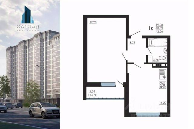 Продаётся 1-комнатная квартира в строящемся доме (улица Димитрова, 131 (Секция 2)), срок сдачи: I-кв. 2028, общей площадью 42.6 кв.м., на 14 этаже. Расположение, транспортная доступность Жилой комплекс "Каскад" строится в развитом районе Воронежа, недалеко от исторического центра. Расстояние до деловых кварталов города всего 5,5 км. На машине этот путь легко преодолеть за несколько минут. У жилого комплекса есть удобный выезд на улицу Димитрова, затем на перекрестке с круговым движением нужно выехать на улицу Брусилова, которая переходит в Чернавский мост, пролегающий через реку Воронеж, а далее по улице Степана Разина добраться до нужной точки в центральной части города. Пассажиры общественного транспорта доберутся до центра за двадцать минут (с учетом ожидания). В ста метрах от ЖК находится остановка "Волгоградская улица", от которой отправляются автобусы и маршрутное такси. Инфраструктура Левобережный район, где расположена новостройка, отличается благоприятной экологической обстановкой и развитой сетью инфраструктуры. На первых этажах здания разместятся магазины и другие коммерческие объекты. Все необходимое для комфортной жизни расположено в непосредственной близости от ЖК. В двух шагах от "Ксакада" - продуктовый рынок, сетевые супермаркеты "Пятью пять", "Пятерочка", почта, аптека "Будь здоров", парикмахерская, салон красоты "Аврора". Немногим дальше расположены пиццерия "Жар-Пицца", банкетный зал "Сказка", магазин хозяйственных товаров и бытовой химии. В шаговой доступности работают средняя общеобразовательная школа и несколько детских садиков. Вокруг много скверов и зеленых насаждений: Витебский сквер, бульвар Димитрова, сквер "Каскад", а неподалеку от него - Олимпийский парк. В нескольких минутах ходьбы находится Автомобильно-транспортный институт, на территории которого работает спортивный клуб, за десять минут можно доехать "Дворца подводного спорта" с бассейном. Надежность застройщика Возведением жилого комплекса занимается ООО "Дон-Инвест". Эта сравнительно молодая строительная организация уже успела заработать репутацию надежного, перспективного, динамично развивающегося застройщика. В проект "Каскад" ООО "Дон-Инвест" вкладывает все силы, тщательно следит за качеством и сроками выполнения строительных работ. В активе компании - успешный опыт строительства коттеджных поселков, а возведение многоэтажного жилого комплекса должно вывести организацию на принципиально новый уровень. Застройщик при поддержке властей принимает участие в городской программе расселения жильцов из ветхого и аварийного фонда, что также свидетельствует о надежности компании. Все сделки заключаются в строгом соответствии с законом. Архитектура ЖК "Каскад" - это монолитно-кирпичный дом переменной этажности (6-14 этажей), состоящий из восьми секций. Фасад будет утеплен, оштукатурен и окрашен в светлой цветовой гамме. Лифтовые зоны и помещения общего пользования будут просторными и удобными, отделанными качественными материалами. В жилом комплексе предусм