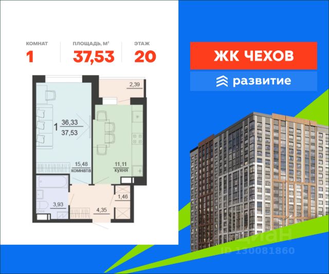 Продается квартира площадью 37.63 кв. м без отделки. Квартира находится на 20 этаже 20 этажного дома, в жилом комплексе "Чехов". Комплекс расположен по адресу - г. Воронеж, ул. Богдана Хмельницкого д. 45а. ЖК "Чехов" - новый проект ГК "Развитие" в Железнодорожном районе. Это современный жилой дом, состоящий из 4 секций с закрытым от шума собственным двором-"полумесяцем", где будет безопасно отпустить ребенка на прогулку и оставить автомобиль на ночь. Это проект для тех, кто ценит удобство и функциональность жилья, кто хочет получить максимальный комфорт за разумную цену. Расположение Пешком: - 4 мин. до автобусной остановки "Мебель Черноземья"; - 15 мин. до Суворовского затона; - 20 мин. до пляжа у Воронежского водохранилища. На автомобиле: - 2 мин. до Ленинского проспекта; - 5 мин. до ж/д станции "Отрожка"; - 15 мин. до центра города; - 20 мин. до вокзала "Воронеж-Южный". Благоустройство - большой озелененный двор; - умное зонирование; - взрослые деревья и живые цветы; - площадки для детей всех возрастов; - развивающий комплекс для самых маленьких; - зоны для фотосессий, особенно интересные подросткам; - спортивные конструкции и тренажеры; - безопасное покрытие на активных площадках; - собственный вишневый сад; - прогулочные и велосипедные дорожки; - отдельная стоянка для машин; - ритейл на первых этажах: рестораны, продуктовые лавки, службы быта. Окружение - 10 образовательных учреждений: школы, детские сады, колледжи, ВУЗы; - торгово-развлекательные центры "Максимир", "Лазурный", "Depo"; - 3 фитнес-центра, гребная база и стадион "Локомотив"; - пляж у Голубого озера, Репнинский лес, Центральный парк, Помологический сад ВГАУ и множество других парковых зон в центре города.