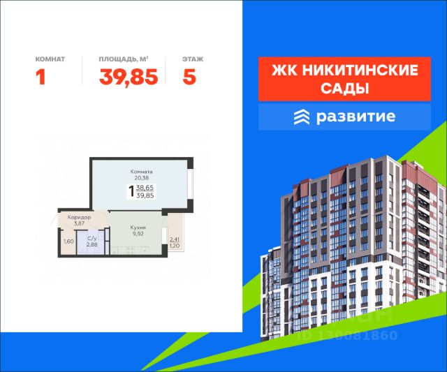 В продаже квартира площадью 35.90 кв. м с черновой отделкой. Квартира расположена на 1 этаже 20 этажного дома, в жилом комплексе комфорт-класса "Никитинские сады". "Никитинские сады" - это новое пространство, которое объединяет в себе современный внешний вид и атмосферу природного уюта. Жилой комплекс включает в себя 4 20-этажных корпуса, 1090 квартир различных планировок, множество общественных пространств для отдыха и собственную инфраструктуру. Наслаждайтесь всеми преимуществами города в окружении живописной природы! Расположение - 10 мин. пешком до остановки "улица Маршала Голикова"; - 5 мин. до бульвара Победы; - 9 мин. до ТРЦ "Арена"; - 20 мин. до ж/д станции "Березовая роща"; - 25 мин. до центра города; Благоустройство - несколько садов во дворе; - озеленение территории; - развивающие комплексы для малышей; - зоны для фотосессий; - скамьи по всему периметру; - прогулочные дорожки; - уличные тренажеры; - турники для воркаута; - мягкое покрытие на активных площадках; - оборудование из натуральных материалов; - освещение территории в вечерние часы; - просторный наземный паркинг; - кафе, магазины и бытовые сервисы на первых этажах. Окружение - природный отдых: Северный лес и лесопарк, пляж у реки Дон, озера Северск, Бычок, Круглое; - активный отдых: спорткомплекс "Арена Север", "Олимпик", футбольная школа и стадион, бассейн "Атлант", теннисный клуб "Спарта"; - культурный отдых: Музей почтового дела, КДЦ "Северный", храм Ксении Петербургской; - городской отдых: ТРЦ Сити-парк "Град" и "Московский проспект", ТРЦ "Арена", множество магазинов, кафе и студий красоты.