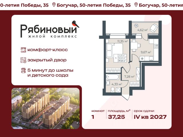 Время выбирать — столичный комфорт прямо в Богучаре! Жилой "Рябиновый" состоит из двух кирпичных домов, один из которых сдается уже осенью 2025 года. Закрытая дворовая территория обеспечивает безопасное пространство для отдыха детей и взрослых, а дети всех возрастов найдут себе занятие по душе на лучшей детской площадке в городе. Дворы и входные группы расположены на одном уровне — нет ступенек, пандусов и лишних препятствий, что позволяет без труда передвигаться маленьким жителям жилого комплекса, их родителям с колясками и пожилым людям. Чистые и светлые подъезды с дизайнерским ремонтом создают приятное впечатление с порога. Для удобства жителей предусмотрены помещения для хранения велосипедов, колясок и спортинвентаря. В каждом подъезде расположены по 2 лифта. Каждая планировка — для жизни. Все площади используются максимально эффективно, в квартирах есть: просторные кухни и гостиные, ниши для шкафов, просторные коридоры, гардеробные и постирочные комнаты. Все квартиры сдаются в улучшенной базовой отделке, которая включает в себя полусухую стяжку, гипсовую штукатурку и разводку электрики. Есть возможность заказать отделку "стандарт" и "премиум", а платеж легко оформить в ипотеку. Оба варианта включают полный набор для комфортного старта: сантехника в санузлах и на кухне, розетки и выключатели, натяжные потолки и межкомнатные двери. В "стандарте" — практичный линолеум и обои, в "премиуме" — стильный ламинат и обои под покраску. Жилой комплекс "Рябиновый" прекрасно подойдет для тех, кто предпочитает сочетание комфорта и технологичности современной квартиры с уютом природы и небольшого города вокруг. Адрес: г. Богучар (Воронежская область) Высота: 9 этажей Квартиры: 186 квартир в первой очереди Материал: кирпич Площадь: 9 779 кв.м жилья в первой очереди 1-комнатной квартиры первичка в Богучарском районе Воронежской области.