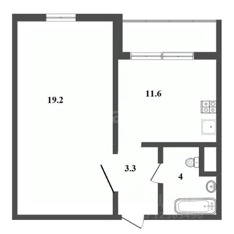 Площадь кухни 9,6 м2, площадь комнаты 15,1 м2.