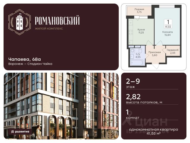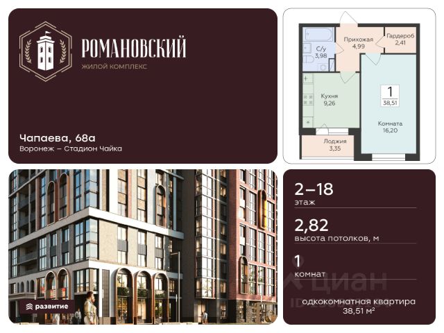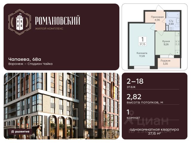 Жилой комплекс "Романовский" - проект класса "комфорт плюс", расположенный на улице Чапаева, в месте, где история встречается с современностью. Соседство с объектом культурного наследия "Водонапорная башня Романовской слободы" делает жилой комплекс воплощением статусности, комфорта и умиротворения. Выбирайте спокойную размеренную жизнь в шумном мегаполисе, не отказываясь от привычных занятий и увлечений. Прогулочный бульвар, стадион для спорта на свежем воздухе, супермаркеты, креативный кластер здесь есть всё, что нужно для полноценной наполненной жизни. Территория двора продумана так, чтобы каждый нашёл здесь занятие по душе. Игровые площадки с безопасным покрытием зонированы по возрасту и создают все условия для игр и общения детей. Современная спортивная площадка с воркаут-зоной поможет поддерживать себя в форме адептам спортивного образа жизни. Планировочные решения квартир спроектированы с учётом современных тенденций и удовлетворяют все потребности будущих жителей. Пространство каждой квартиры продумано до мелочей: • эргономичные студии с зонами для хранения в прихожей; • классические однокомнатные квартиры с гардеробными и большими кухнями; • двухкомнатные квартиры евро-формата с мастер-спальнями гардеробными комнатами; • просторные трёх- и четырёхкомнатные квартиры классического и евро-формата с гостиными, гардеробными и двумя санузлами. В холлах первых этажей спроектированы помещения для колясок и комнаты-лапомойки для ваших питомцев. На каждом этаже ЖК "Романовский" мы предусмотрели кладовые комнаты для хранения сезонных вещей. В проекте будет построен подземный паркинг и наземная парковка на прилегающей территории, рассчитанная на 258 мест. Несмотря на то, что парковка находится в непосредственной близости к подъездам, она не нарушает концепцию двора без машин. Ввод в эксплуатацию запланирован в 4 квартале 2027 года согласно проектной документации. Покупая квартиру в ЖК "Романовский" от ГК Развитие, вы получаете дополнительно БЕСПЛАТНО: - помощь в одобрении и получении ипотеки с минимальной процентной ставкой. - ПОЛНОЕ ЮРИДИЧЕСКОЕ СОПРОВОЖДЕНИЕ сделки купли-продажи - Помощь в реализации МАТЕРИНСКОГО капитала. - Консультация и показ объекта в любое УДОБНОЕ ВРЕМЯ - Помощь в ПОДГОТОВКЕ И СБОРЕ ВСЕХ ДОКУМЕНТОВ, необходимых для покупки. 1-комнатная квартира на улице Чапаева в городе Воронеж.