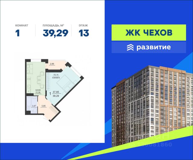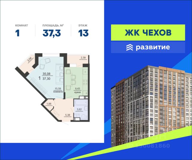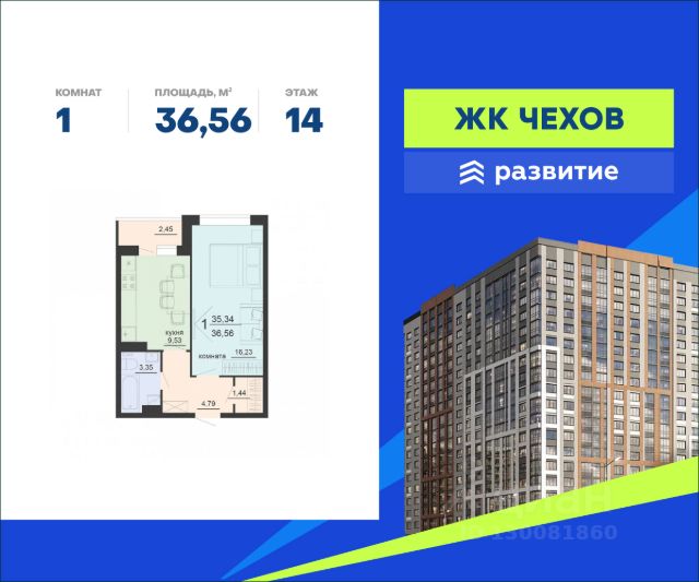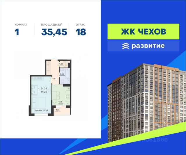 Продается квартира площадью 35.45 кв. м без отделки. Квартира находится на 16 этаже 20 этажного дома, в жилом комплексе "Чехов". Комплекс расположен по адресу - г. Воронеж, ул. Богдана Хмельницкого д. 45а. ЖК "Чехов" - новый проект ГК "Развитие" в Железнодорожном районе. Это современный жилой дом, состоящий из 4 секций с закрытым от шума собственным двором-"полумесяцем", где будет безопасно отпустить ребенка на прогулку и оставить автомобиль на ночь. Это проект для тех, кто ценит удобство и функциональность жилья, кто хочет получить максимальный комфорт за разумную цену. Расположение Пешком: - 4 мин. до автобусной остановки "Мебель Черноземья"; - 15 мин. до Суворовского затона; - 20 мин. до пляжа у Воронежского водохранилища. На автомобиле: - 2 мин. до Ленинского проспекта; - 5 мин. до ж/д станции "Отрожка"; - 15 мин. до центра города; - 20 мин. до вокзала "Воронеж-Южный". Благоустройство - большой озелененный двор; - умное зонирование; - взрослые деревья и живые цветы; - площадки для детей всех возрастов; - развивающий комплекс для самых маленьких; - зоны для фотосессий, особенно интересные подросткам; - спортивные конструкции и тренажеры; - безопасное покрытие на активных площадках; - собственный вишневый сад; - прогулочные и велосипедные дорожки; - отдельная стоянка для машин; - ритейл на первых этажах: рестораны, продуктовые лавки, службы быта. Окружение - 10 образовательных учреждений: школы, детские сады, колледжи, ВУЗы; - торгово-развлекательные центры "Максимир", "Лазурный", "Depo"; - 3 фитнес-центра, гребная база и стадион "Локомотив"; - пляж у Голубого озера, Репнинский лес, Центральный парк, Помологический сад ВГАУ и множество других парковых зон в центре города.