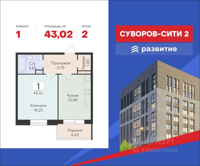 В жилом комплексе, расположенном в 4 километрах от исторического центра Воронежа, продается 1-комнатная квартира площадью 33.36 кв. м с черновой отделкой. Квартира расположена на 2 этаже корпуса 10908586 (ЖК "Суворов Сити 2" (1-й этап, ПОЗИ жилого комплекса комфорт-класса "Суворов Сити II" от федерального застройщика ГК "Развитие". Жилой комплекс "Суворов Сити II" - продолжение современного масштабного проекта "Суворов Сити", находящегося в спальном районе в четырех километрах от центра города. Проект сочетает удачное расположение с удобными планировками, актуальным дизайном и приватным двором. Расположение Пешком: - 5-10 минут - Автобусные остановки; - 12 минут - Школа 50; - 15 минут - Детский сад 174; - 20 минут - ТРЦ "Армада". На автомобиле: - 1 минута - улица Матросова; - 5 минут - улица Ворошилова, проспект Патриотов; - 10 минут - Вогрэсовский мост; - 15 минут - проспект Революции, Чернавский мост, вокзал "Воронеж-1"; - 30 минут - выезд на М-4; - 50 минут - аэропорт "Воронеж". Лобби - Колясочная; - Лапомойка для питомцев; - Входные группы с окнами в пол; - Лифты с возможностью спуска в подземный паркинг на 465 машиномест. Благоустройство - Двор закрыт от прохожих и транспорта; - Доступ на внутреннюю территорию, в парадные и в паркинг по ключам; - Круглосуточное видеонаблюдение; - Собственная инфраструктура (важные магазины и сервисы) на первом этаже здания; - Детский сад во дворе ЖК; - Пешеходная аллея; - Места для отдыха со скамейками и перголами; - Детские игровые и спортивные площадки; - Навигационная подсветка в темное время суток. Окружение - Спокойный спальный район; - Близко магазины, кафе, медклиник, салонов красоты, аптек; - В шаговой доступности - скверы, сады, ТРЦ, стадион. О застройщике Федеральный застройщик ГК "Развитие" лидирует по количеству возводимых объектов и входит в ТОП-20 девелоперов России. За 10 лет на рынке компания ввела в эксплуатацию свыше 700 тыс. кв. м жилья, еще столько же находится в стадии строительства. В портфеле - 30 завершенных проектов и более десятка тысяч заселенных квартир. Девелопер сотрудничает с ведущими отраслевыми партнерами, включая "Северсталь" и "Технониколь". "Развитие" специализируется на строительстве жилых комплексов и микрорайонов, развитии инфраструктуры и создании комфортной городской среды. Девелопер реализует проекты в Воронеже, Москве и области, Ленинградской области, Крыму, Орле и Самаре. Основные форматы - ЖК комфорт- и бизнес-класса, апарт-отели, прибрежные премиальные комплексы и жилые кластеры с коммерцией, парковками и благоустроенными дворами.