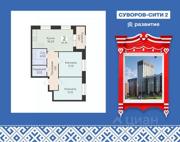 Продается 2-комнатная квартира 56,48 кв.м. на 2 этаже. Жилой комплекс "Суворов Сити II" — продолжение современного масштабного проекта "Суворов Сити", находящегося в спальном районе в четырех километрах от центра города. Проект сочетает удачное расположение с удобными планировками, актуальным дизайном и приватным двором. Расположение Пешком: — 510 минут Автобусные остановки; — 12 минут Школа 50; — 15 минут Детский сад 174; — 20 минут ТРЦ "Армада". На автомобиле: — 1 минута улица Матросова; — 5 минут улица Ворошилова, проспект Патриотов; — 10 минут Вогрэсовский мост; — 15 минут проспект Революции, Чернавский мост, вокзал "Воронеж-1"; — 30 минут выезд на М-4; — 50 минут аэропорт "Воронеж". Лобби — Колясочная; — Лапомойка для питомцев; — Входные группы с окнами в пол; — Лифты с возможностью спуска в подземный паркинг на 465 машиномест. Благоустройство — Двор закрыт от прохожих и транспорта; — Доступ на внутреннюю территорию, в парадные и в паркинг по ключам; — Круглосуточное видеонаблюдение; — Собственная инфраструктура (важные магазины и сервисы) на первом этаже здания; — Детский сад во дворе ЖК; — Пешеходная аллея; — Места для отдыха со скамейками и перголами; — Детские игровые и спортивные площадки; — Навигационная подсветка в темное время суток. Окружение — Спокойный спальный район; — Близко магазины, кафе, медклиник, салонов красоты, аптек; — В шаговой доступности скверы, сады, ТРЦ, стадион. О застройщике Федеральный застройщик ГК "Развитие" лидирует по количеству возводимых объектов и входит в ТОП-20 девелоперов России. За 10 лет на рынке компания ввела в эксплуатацию свыше 700 тыс. кв. м жилья, еще столько же находится в стадии строительства. В портфеле — 30 завершенных проектов и более десятка тысяч заселенных квартир. Девелопер сотрудничает с ведущими отраслевыми партнерами, включая "Северсталь" и "Технониколь". "Развитие" специализируется на строительстве жилых комплексов и микрорайонов, развитии инфраструктуры и создании комфортной городской среды. Девелопер реализует проекты в Воронеже, Москве и области, Ленинградской области, Крыму, Орле и Самаре. Основные форматы — ЖК комфорт- и бизнес-класса, апарт-отели, прибрежные премиальные комплексы и жилые кластеры с коммерцией, парковками и благоустроенными дворами.