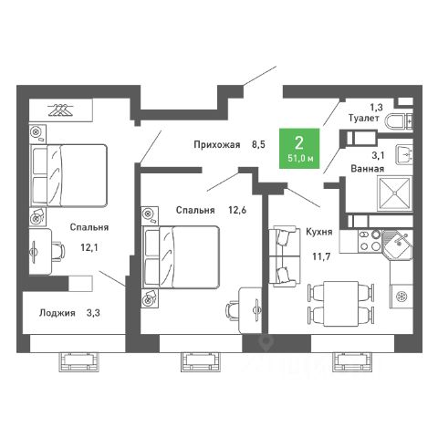 Кухня-гостиная, Спальни на разные стороны, Гардеробная, Лоджия из кухни.