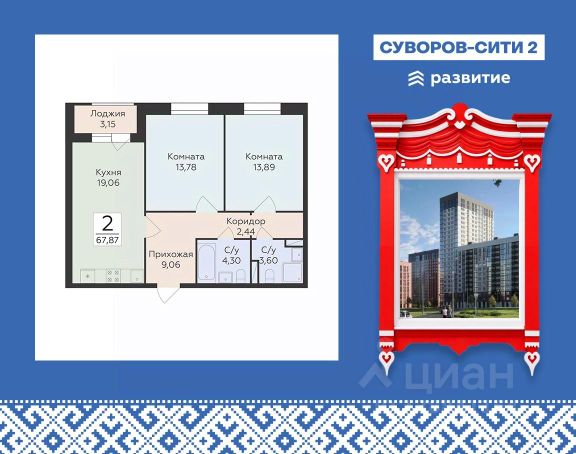 Жилой комплекс "Суворов Сити II" — продолжение современного масштабного проекта "Суворов Сити", находящегося в спальном районе в четырех километрах от центра города. Проект сочетает удачное расположение с удобными планировками, актуальным дизайном и приватным двором. Расположение Пешком: — 510 минут Автобусные остановки; — 12 минут Школа 50; — 15 минут Детский сад 174; — 20 минут ТРЦ "Армада". На автомобиле: — 1 минута улица Матросова; — 5 минут улица Ворошилова, проспект Патриотов; — 10 минут Вогрэсовский мост; — 15 минут проспект Революции, Чернавский мост, вокзал "Воронеж-1"; — 30 минут выезд на М-4; — 50 минут аэропорт "Воронеж". Лобби — Колясочная; — Лапомойка для питомцев; — Входные группы с окнами в пол; — Лифты с возможностью спуска в подземный паркинг на 465 машиномест. Благоустройство — Двор закрыт от прохожих и транспорта; — Доступ на внутреннюю территорию, в парадные и в паркинг по ключам; — Круглосуточное видеонаблюдение; — Собственная инфраструктура (важные магазины и сервисы) на первом этаже здания; — Детский сад во дворе ЖК; — Пешеходная аллея; — Места для отдыха со скамейками и перголами; — Детские игровые и спортивные площадки; — Навигационная подсветка в темное время суток. Окружение — Спокойный спальный район; — Близко магазины, кафе, медклиник, салонов красоты, аптек; — В шаговой доступности скверы, сады, ТРЦ, стадион. О застройщике Федеральный застройщик ГК "Развитие" лидирует по количеству возводимых объектов и входит в ТОП-20 девелоперов России. За 10 лет на рынке компания ввела в эксплуатацию свыше 700 тыс. кв. м жилья, еще столько же находится в стадии строительства. В портфеле — 30 завершенных проектов и более десятка тысяч заселенных квартир. Девелопер сотрудничает с ведущими отраслевыми партнерами, включая "Северсталь" и "Технониколь". "Развитие" специализируется на строительстве жилых комплексов и микрорайонов, развитии инфраструктуры и создании комфортной городской среды. Девелопер реализует проекты в Воронеже, Москве и области, Ленинградской области, Крыму, Орле и Самаре. Основные форматы — ЖК комфорт- и бизнес-класса, апарт-отели, прибрежные премиальные комплексы и жилые кластеры с коммерцией, парковками и благоустроенными дворами.