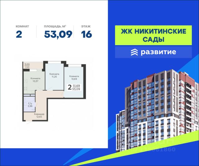 В продаже квартира площадью 53.66 кв. м с отделкой. Квартира расположена на 16 этаже 20 этажного дома, в жилом комплексе комфорт-класса "Никитинские сады". "Никитинские сады" - это новое пространство, которое объединяет в себе современный внешний вид и атмосферу природного уюта. Жилой комплекс включает в себя 4 20-этажных корпуса, 1090 квартир различных планировок, множество общественных пространств для отдыха и собственную инфраструктуру. Наслаждайтесь всеми преимуществами города в окружении живописной природы! Расположение - 10 мин. пешком до остановки "улица Маршала Голикова"; - 5 мин. до бульвара Победы; - 9 мин. до ТРЦ "Арена"; - 20 мин. до ж/д станции "Березовая роща"; - 25 мин. до центра города; Благоустройство - несколько садов во дворе; - озеленение территории; - развивающие комплексы для малышей; - зоны для фотосессий; - скамьи по всему периметру; - прогулочные дорожки; - уличные тренажеры; - турники для воркаута; - мягкое покрытие на активных площадках; - оборудование из натуральных материалов; - освещение территории в вечерние часы; - просторный наземный паркинг; - кафе, магазины и бытовые сервисы на первых этажах. Окружение - природный отдых: Северный лес и лесопарк, пляж у реки Дон, озера Северск, Бычок, Круглое; - активный отдых: спорткомплекс "Арена Север", "Олимпик", футбольная школа и стадион, бассейн "Атлант", теннисный клуб "Спарта"; - культурный отдых: Музей почтового дела, КДЦ "Северный", храм Ксении Петербургской; - городской отдых: ТРЦ Сити-парк "Град" и "Московский проспект", ТРЦ "Арена", множество магазинов, кафе и студий красоты.