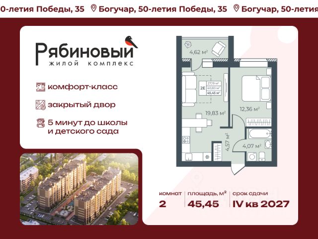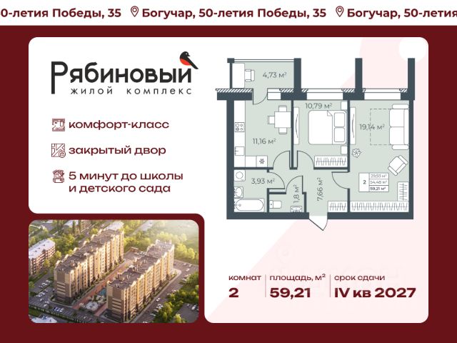 Время выбирать — столичный комфорт прямо в Богучаре! Жилой "Рябиновый" состоит из двух кирпичных домов, один из которых сдается уже осенью 2025 года. Закрытая дворовая территория обеспечивает безопасное пространство для отдыха детей и взрослых, а дети всех возрастов найдут себе занятие по душе на лучшей детской площадке в городе. Дворы и входные группы расположены на одном уровне — нет ступенек, пандусов и лишних препятствий, что позволяет без труда передвигаться маленьким жителям жилого комплекса, их родителям с колясками и пожилым людям. Чистые и светлые подъезды с дизайнерским ремонтом создают приятное впечатление с порога. Для удобства жителей предусмотрены помещения для хранения велосипедов, колясок и спортинвентаря. В каждом подъезде расположены по 2 лифта. Каждая планировка — для жизни. Все площади используются максимально эффективно, в квартирах есть: просторные кухни и гостиные, ниши для шкафов, просторные коридоры, гардеробные и постирочные комнаты. Все квартиры сдаются в улучшенной базовой отделке, которая включает в себя полусухую стяжку, гипсовую штукатурку и разводку электрики. Есть возможность заказать отделку "стандарт" и "премиум", а платеж легко оформить в ипотеку. Оба варианта включают полный набор для комфортного старта: сантехника в санузлах и на кухне, розетки и выключатели, натяжные потолки и межкомнатные двери. В "стандарте" — практичный линолеум и обои, в "премиуме" — стильный ламинат и обои под покраску. Жилой комплекс "Рябиновый" прекрасно подойдет для тех, кто предпочитает сочетание комфорта и технологичности современной квартиры с уютом природы и небольшого города вокруг. Адрес: г. Богучар (Воронежская область) Высота: 9 этажей Квартиры: 186 квартир в первой очереди Материал: кирпич Площадь: 9 779 кв.м жилья в первой очереди