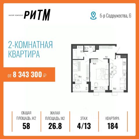 ЖК "РИТМ" — ДОСТУПНАЯ И ВЫГОДНАЯ ИНВЕСТИЦИЯ В ВАШЕ БУДУЩЕЕ Жилой комплекс "Ритм" по ул. Бульвар Содружества уч. 6 — часть масштабного проекта развития территории воронежского левобережья — микрорайона "Ключи", который займет 28,6 га недалеко от въезда в город по тамбовскому направлению. Здесь строится инновационный красивый мини-город. Он насыщен социальной и коммерческой инфраструктурой и обеспечен новейшими коммуникациями. Комплекс состоит не только из качественных домов. Решения по благоустройству стимулируют ведение активного здорового образа жизни. Продуманы возможности для взаимодействия людей, их творческой самореализации, выстраивания добрососедских связей и формирования современного приятного комьюнити. И все это на благоприятном экологическом фоне. Это действительно новый шаг в создании привлекательной среды для жизни в современном ритме! Жить, не ограничивая себя и свою семью, — разве не об этом вы мечтали? Вас ждет инновационное пространство, где вы будете вести свою насыщенную и интересную жизнь в выбранном вами ритме. Подземный паркинг на -1 этаже вместимостью на 114 машино-места, в том числе семейные парковки на два автомобиля освобождает двор от машин — там гораздо приятнее гулять с детьми или заниматься спортом. Жители смогут выходить к своему автомобилю в теплый паркинг прямо из лифта — нет беспокойства из-за погодных условий или за сохранность транспортного средства. Ваши гости тоже не останутся без парковки — на придомовой территории организовано - 131 место и вне придомовой территории - 213 мест. Для абсолютного комфорта на -1 этаже в каждой секции расположены кладовые помещение площадью от 2,10 до 5,0 кв.м., где можно хранить все что угодно — велосипеды, санки, лыжи и прочие вещи. Они больше не будут занимать весь балкон. Там гораздо приятнее пить кофе и любоваться видом из окна. ИНФРАСТРУКТУРА и ПРЕИМУЩЕСТВА Инновационное жилье в ЖК "Ритм" совсем рядом — 5 минут до Остужевского кольца, 20 минут до центра, рядом новая транспортная развязка. Легко добраться до работы и вузов, на концерт или в гости. Первый цифровой квартал в городе Дворы без машин Подземный паркинг и кладовые (в каждой секции) Сервисная Управляющая Компания (Smile) Новая инфраструктура района и коммуникаций Рядом с вами: новая уже действующая школа - 3 минут (просто перейти дорогу) новый детский сад (проект на стадии разработки, ориентировочный срок сдачи конец 2026 года) - 5 минут (просто перейти дорогу) 5 минут от центральной площади событий и прогулочных аллей стадион и спортивные площадки поликлиника (проект на стадии разработки) магазины аптеки детские площадки
