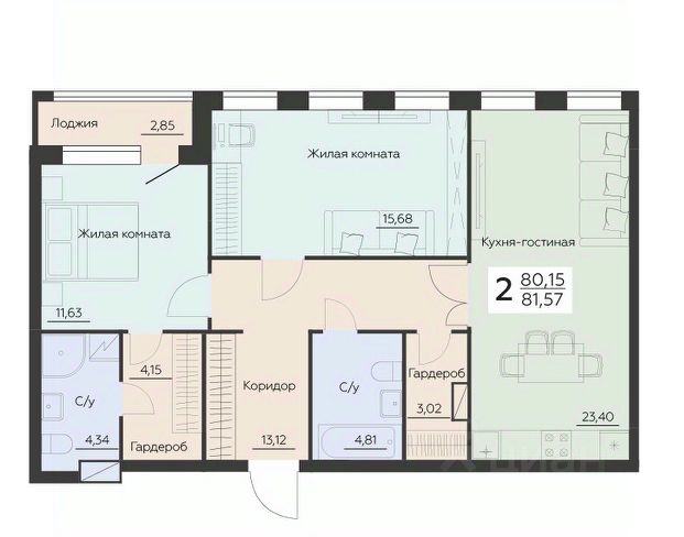 Квартира: 2 к 57,70 кв.м., 5 этаж в комплексе Ю, 2 очередь, корп.2, сдача: 1кв. , этажей: 15, адрес Воронеж г., Цимлянская ул., д. 10в корп. 2, Застройщик: Еврострой.