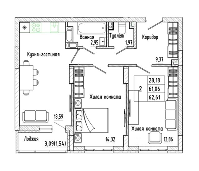 Продаётся 2-комнатная квартира в строящемся доме (Ленинградская улица, 29Б (БС 1-4, 1 этап)), срок сдачи: II-кв. 2029, общей площадью 62.18 кв.м., на 6 этаже. Новый жилой комплекс от группы компаний "Развитие" расположен по адресу: г. .Воронеж, по ул. Ленинградская.