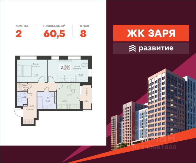 В продаже квартира площадью 60.50 кв. м с черновой отделкой. Квартира расположена на 8 этаже 14 этажного дома, в новом жилом комплексе "Заря" от федерального девелопера "Развитие". Жилой Комплекс "Заря" - это стильный, комфортный и современный проект с уникальной для Воронежа инфраструктурой. Между зданиями уютно расположится приватный благоустроенный двор-патио - мини оазис с пешеходными дорожками. Все это дополняет отличная транспортная доступность, неординарная архитектура, множество эксклюзивных форматов жилья, собственный подземный паркинг на 240 мест. "Заря" - новый стандарт комфортной городской жизни. Расположение Пешком: - 5 минут до ТЦ "Европа"; - 6 минут до остановки "Улица Брусилова"; - 7 минут до ул. Ильича; - 10 мин. до Ленинского проспекта. На машине: - 3 мин. до Чернавского моста; - 5 мин. до СК "Чернавская дамба" - 6 мин. до парка "Алые паруса"; - 7-10 минут до центра города и Петровской набережной. Благоустройство - стильное лобби с авторским дизайном; - теплая зона ожидания; - вместительные колясочные и велосипедные помещения; - лифты с доступом в паркинг; - кладовые на каждом этаже; - приватный двор-патио; - камерные лаунж-зоны в окружении зелени; - большое разнообразие растений: клены, ивы, можжевельник, китайская сирень и другие; - умное зонирование: тихие и шумные площадки удалены друг от друга; - беговые, прогулочные, велосипедные дорожки; - площадки для малышей и подростков; - спортивные корты и тренажеры; - общественный променад с ритейлом; - собственный деловой центр; - кафе, творческие студии, спортивные секции и магазины прямо на первом этаже дома. Окружение - места для прогулок: парк Патриотов, парк и пляж "Алые Паруса", сквер Ильича, бульвар "Ленинский проспект" у Воронежского водохранилища; - активный отдых: яхт-клуб, Центральный стадион, спорткомплекс Platinum Arena, фитнес-центр "Олимп" с бассейном; - все нужное рядом: ТЦ "Европа", школы и детские сады, поликлиника, центр педиатрии; - близость к центру: Центральный парк, Воронежский концертный зал, здание Управления ЮВЖД, Благовещенский собор.