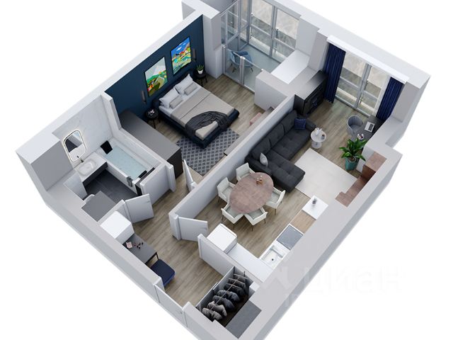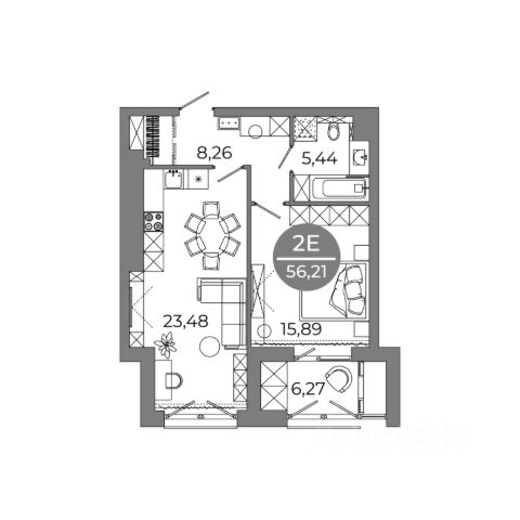 Эта квартира в полной мере отражает современный формат смарт-планировки. Главная спальня дополнена отдельными гардеробной и душевой. Габариты каждого помещения выверены до сантиметра для максимально логичной расстановки мебели. Собственная терраса отлично дополнит функционал жилья.