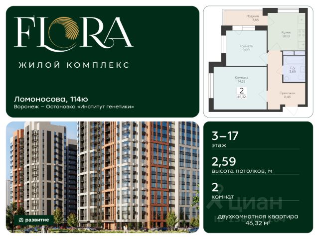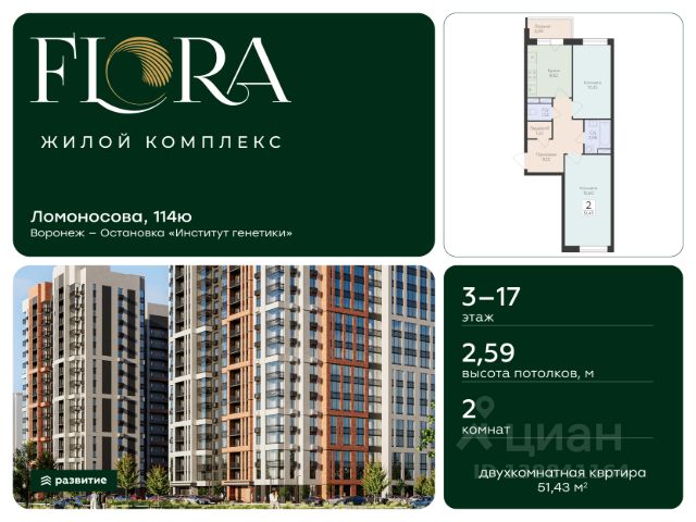 Жилой комплекс "FLORA" - проект комфорт-класса, расположенный в одном из самых привлекательных и зелёных районов Воронежа на улице Ломоносова. Государственный природный заповедник, множество образовательных учреждений с качественным уровнем обучения, большой коммерческий фронт для развития малого и среднего бизнеса, центры здоровья и спорта всё это располагается в шаге от жилого комплекса. А свободный доступ к главным городским автомагистралям и транспортным развязкам позволит быть мобильными и смело прокладывать маршруты в любую точку города на автомобиле или общественном транспорте, на велосипеде или пешком. Двор FLORA — это безопасное мультифункциональное пространство для жителей разных возрастов и интересов. Игровые комплексы, установленные на безопасном тартановом покрытии, дарят детям пространство, где они могут быть шумными, активными, неугомонными и желающим изучать мир во всех его проявлениях. Для тех, кто предпочитает активный образ жизни, в жилом комплексе FLORA предусмотрено workout-пространство на свежем воздухе. Продуманные планировочные решения квартир в жилом комплексе FLORA полностью отвечают потребностям жизни современных городских жителей: - комфортные студии отличный выбор для амбициозных студентов - просторные однокомнатные квартиры с гардеробными комнатами для молодых семей - двух и трёхкомнатные квартиры c гардеробными и двумя санузлами для семей с детьми Ввод в эксплуатацию запланирован в 4 квартале 2029 года согласно проектной документации. Покупая квартиру в ЖК "FLORA" от ГК Развитие, вы получаете дополнительно БЕСПЛАТНО: - помощь в одобрении и получении ипотеки с минимальной процентной ставкой. - ПОЛНОЕ ЮРИДИЧЕСКОЕ СОПРОВОЖДЕНИЕ сделки купли-продажи - Помощь в реализации МАТЕРИНСКОГО капитала. - Консультация и показ объекта в любое УДОБНОЕ ВРЕМЯ - Помощь в ПОДГОТОВКЕ И СБОРЕ ВСЕХ ДОКУМЕНТОВ, необходимых для покупки.