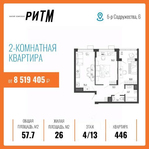 ЖК "РИТМ" — ДОСТУПНАЯ И ВЫГОДНАЯ ИНВЕСТИЦИЯ В ВАШЕ БУДУЩЕЕ Жилой комплекс "Ритм" по ул. Бульвар Содружества уч. 6 — часть масштабного проекта развития территории воронежского левобережья — микрорайона "Ключи", который займет 28,6 га недалеко от въезда в город по тамбовскому направлению. Здесь строится инновационный красивый мини-город. Он насыщен социальной и коммерческой инфраструктурой и обеспечен новейшими коммуникациями. Комплекс состоит не только из качественных домов. Решения по благоустройству стимулируют ведение активного здорового образа жизни. Продуманы возможности для взаимодействия людей, их творческой самореализации, выстраивания добрососедских связей и формирования современного приятного комьюнити. И все это на благоприятном экологическом фоне. Это действительно новый шаг в создании привлекательной среды для жизни в современном ритме! Жить, не ограничивая себя и свою семью, — разве не об этом вы мечтали? Вас ждет инновационное пространство, где вы будете вести свою насыщенную и интересную жизнь в выбранном вами ритме. Подземный паркинг на -1 этаже вместимостью на 114 машино-места, в том числе семейные парковки на два автомобиля освобождает двор от машин — там гораздо приятнее гулять с детьми или заниматься спортом. Жители смогут выходить к своему автомобилю в теплый паркинг прямо из лифта — нет беспокойства из-за погодных условий или за сохранность транспортного средства. Ваши гости тоже не останутся без парковки — на придомовой территории организовано - 131 место и вне придомовой территории - 213 мест. Для абсолютного комфорта на -1 этаже в каждой секции расположены кладовые помещение площадью от 2,10 до 5,0 кв.м., где можно хранить все что угодно — велосипеды, санки, лыжи и прочие вещи. Они больше не будут занимать весь балкон. Там гораздо приятнее пить кофе и любоваться видом из окна. ИНФРАСТРУКТУРА и ПРЕИМУЩЕСТВА Инновационное жилье в ЖК "Ритм" совсем рядом — 5 минут до Остужевского кольца, 20 минут до центра, рядом новая транспортная развязка. Легко добраться до работы и вузов, на концерт или в гости. Первый цифровой квартал в городе Дворы без машин Подземный паркинг и кладовые (в каждой секции) Сервисная Управляющая Компания (Smile) Новая инфраструктура района и коммуникаций Рядом с вами: новая уже действующая школа - 3 минут (просто перейти дорогу) новый детский сад (проект на стадии разработки, ориентировочный срок сдачи конец 2026 года) - 5 минут (просто перейти дорогу) 5 минут от центральной площади событий и прогулочных аллей стадион и спортивные площадки поликлиника (проект на стадии разработки) магазины аптеки детские площадки