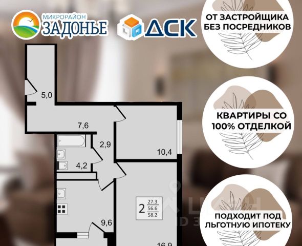 Продаётся 2-комнатная квартира в строящемся доме (Московский проспект, 179/14 (Позиция 5)), срок сдачи: II-кв. 2026, общей площадью 58.2 кв.м., на 12 этаже. Жилой комплекс "Задонье" представляет собой группу панельных зданий, расположенных на севере Воронежа - на Московском проспекте. Согласно проектной документации, в кварталах 8 и 10 жилого массива "Задонье" застройщик возведет семь 18-этажных домов и три 26-этажных. Площадь участка - 8,3 га, ориентировочная численность населения - 3,3 тыс. человек. В жилом комплексе запланировано строительство детского сада на 140 мест и поликлиники на 254 посещения в смену. Проект планировки предполагает создание 1150 парковочных мест. Транспортное сообщение с центром города обеспечит Московский проспект. 2-комнатная квартира 2-комнатных квартир в Задонье в Воронеже.