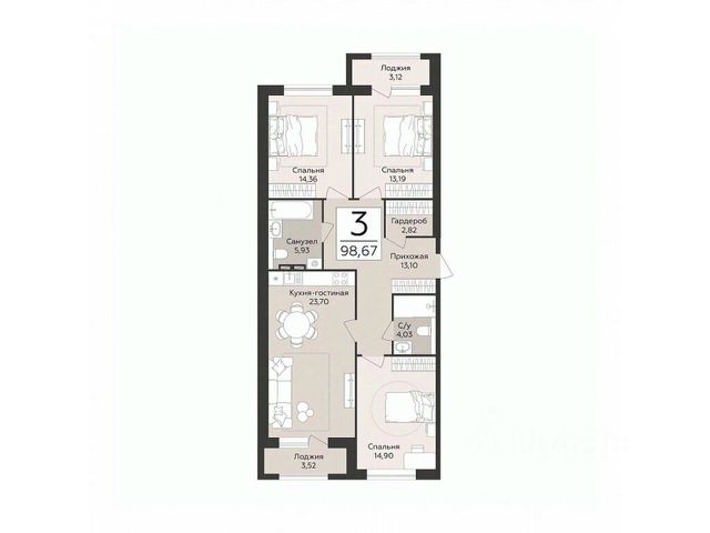 Жилой комплекс "Бунин" — проект с удивительной концепцией и необыкновенной архитектурой, невероятно комфортным и функциональным пространством для жизни. Авторы проекта — голландская архитектурная компания "KCAP Architects&Planners" в сотрудничестве с архитектурным бюро "А.Лен" (г. Санкт-Петербург). Жилой комплекс "Бунин" расположен на въезде в Воронеж со стороны Москвы, вдоль одной из главных городских магистралей - Московского проспекта. Оригинальная архитектурная композиция стилизована под стопки книг — вертикальные и горизонтальные. Книжные полки, обложки книг, страницы — все эти элементы узнаются в форме и отделке зданий. Технология строительства — монолитная. Входные группы подъездов, расположенные со стороны двора, выполнены в уровень земли, без ступеней и пандусов. В каждом подъезде оборудованы колясочные. Надежные и просторные лифты (в каждом подъезде по 2-3 лифта), в которые легко поместится велосипед и детская коляска. Входные двери парадных с витражным отделением, большие окна в местах общего пользования, а также датчики движения делают общее пространство светлым, безопасным и экономичным. Будут оборудованы места для службы консьержей. Пространство с благоустройством разделено на две зоны. Со стороны Московского проспекта будет организован сосновый сквер с прогулочными аллеями и общественными пространствами с зонами отдыха. С обратной стороны, рядом с яблоневым садом, будет находиться основное дворовое пространство, в которое вписаны детские и спортивные площадки, уличные тренажеры, workout и стилизованные зоны отдыха. Двор будет закрыт от машин. Кофейни, домашние рестораны, магазины, салоны красоты, расположенные на первых этажах коммерческих помещений, сделают жизнь удобной, практичной и чуточку камерной. Неподалеку от дома будет организован большой спортивный городок — с беговыми и велодорожками, площадками для игр в волейбол, стритбол, мини-футбол, настольный теннис и набирающую популярность в России игру в сквош. Двухуровневый подземный паркинг ЖК вмещает более 800 машин. В паркинге будут организованы круглосуточная охрана и видеонаблюдение. Оборудован лифт с жилых этажей, системой вентиляции и пожаротушения. Через дорогу от жилого комплекса, на территории площадью почти 35 гектаров, администрацией города создается полноценный социальный узел, который включает в себя общеобразовательную школу на 2860 мест и детский сад на 600. Рядом будут построены детская школа искусств с библиотекой имени Бунина, поликлиника на 1100 посещений в смену с подстанцией скорой медицинской помощи. А также в проекте предполагается 3 спортивных комплекса для занятий различными видами спорта. Например, такими как плавание, единоборства, настольный теннис, фигурное катание и другие игровые и индивидуальные виды спорта. 3-комнатная квартира, примерная площадь 100 м2 в Воронеже.