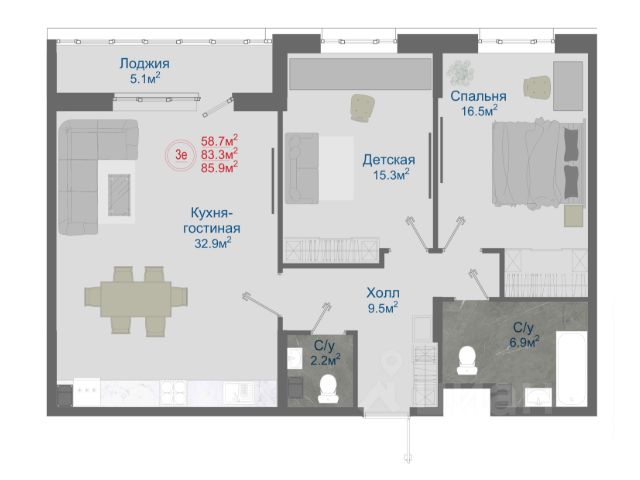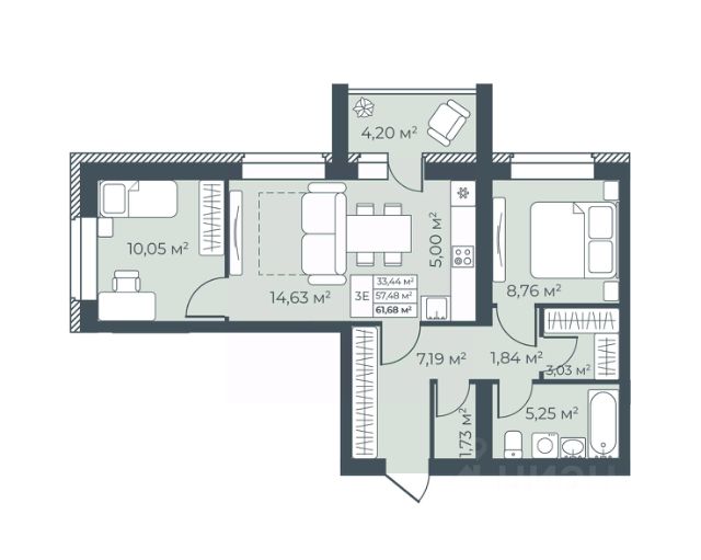 2-комн. квартира от застройщика с отделкой в ЖК "Инстеп. Бабяково" на 1 этаже. Общая площадь: 60.33 кв.м., жилая: 21.82 кв.м., площадь просторной кухни-столовой: 19.25 кв.м. Комнаты изолированные, все окна выходят на одну сторону. В квартире одна лоджия, один раздельный санузел. Высота потолков 2.64 м.