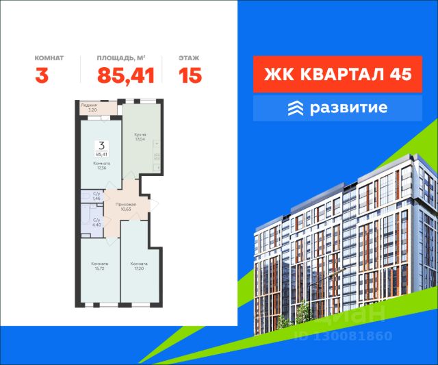 В продаже квартира площадью 85.41 кв. м с черновой отделкой. Квартира расположена на 15 этаже 18 этажного дома, в жилом комплексе комфорт-класса "Квартал 45". "Квартал 45" - это амбициозный проект будущего сердца Московского проспекта, в котором объединены лучшие градостроительные традиции, уникальная архитектура и современные технологии дизайна. Удачная локация рядом с центром, функциональные планировки, приватный парк в шаге от дома, собственный подземный паркинг на 187 машино-мест. Проект от федерального застройщика "Развитие" сочетает в себе все преимущества современного комфортного жилья. Расположение Пешком: - 3 мин. до остановки "Московский проспект"; - 5 мин. до Центрального автовокзала; - 15 мин. до уютного Коминтерновского сквера. На автомобиле: - 10 мин. до центра Воронежа; - 10 мин. до Ботанического сада; - 15 мин. до Петровской набережной. Благоустройство - приватный двор для жителей; - безопасность: нет машин, работают видеокамеры; - много зелени: деревья, кустарники, газоны; - тихие места для отдыха на свежем воздухе; - спортивный корт для командных игр; - силовые тренажеры и турники; - игровой городок для детей всех возрастов; - лужайки для пикников; - велосипедные и беговые дорожки; - длинный прогулочный бульвар; - просторный холл с авторским дизайном; - 2 лифта в каждом подъезде - грузовой и пассажирский; - удобные зоны хранения колясок и спортивного инвентаря; - кафе, продуктовые магазины, салоны красоты и другая инфраструктура на первом этаже дома. Окружение - 5 парков в пределах 10 минут: Центральный парк, Ботанический сад ВГУ, Лесопарковый участок НИИЛГиС, парк Победы, Северный лес; - спорткомплекс и стадион "Динамо", "Арена Север", Центральный стадион профсоюзов; - детская и взрослая областная больница, несколько частных клиник; - ТРЦ "Московский проспект", ТЦ "Москва", множество сетевых супермаркетов.