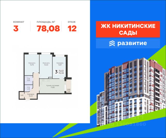 В продаже квартира площадью 79.21 кв. м с черновой отделкой. Квартира расположена на 12 этаже 20 этажного дома, в жилом комплексе комфорт-класса "Никитинские сады". "Никитинские сады" - это новое пространство, которое объединяет в себе современный внешний вид и атмосферу природного уюта. Жилой комплекс включает в себя 4 20-этажных корпуса, 1090 квартир различных планировок, множество общественных пространств для отдыха и собственную инфраструктуру. Наслаждайтесь всеми преимуществами города в окружении живописной природы! Расположение - 10 мин. пешком до остановки "улица Маршала Голикова"; - 5 мин. до бульвара Победы; - 9 мин. до ТРЦ "Арена"; - 20 мин. до ж/д станции "Березовая роща"; - 25 мин. до центра города; Благоустройство - несколько садов во дворе; - озеленение территории; - развивающие комплексы для малышей; - зоны для фотосессий; - скамьи по всему периметру; - прогулочные дорожки; - уличные тренажеры; - турники для воркаута; - мягкое покрытие на активных площадках; - оборудование из натуральных материалов; - освещение территории в вечерние часы; - просторный наземный паркинг; - кафе, магазины и бытовые сервисы на первых этажах. Окружение - природный отдых: Северный лес и лесопарк, пляж у реки Дон, озера Северск, Бычок, Круглое; - активный отдых: спорткомплекс "Арена Север", "Олимпик", футбольная школа и стадион, бассейн "Атлант", теннисный клуб "Спарта"; - культурный отдых: Музей почтового дела, КДЦ "Северный", храм Ксении Петербургской; - городской отдых: ТРЦ Сити-парк "Град" и "Московский проспект", ТРЦ "Арена", множество магазинов, кафе и студий красоты.