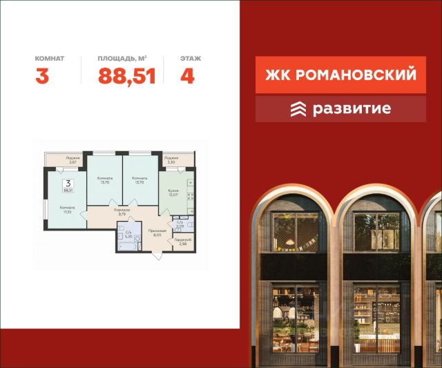 В продаже квартира площадью 88.51 кв. м с черновой отделкой. Квартира расположена на 4 этаже 18 этажного дома, в жилом комплексе "комфорт плюс" класса "Романовский". "Романовский" - это жилой комплекс нового поколения для комфортной жизни в городе. Особое внимание к деталям, амбициозная архитектурная концепция, планировки нового формата, высокое качество и привлекательная локация - вот из чего складывается ваша идеальная жизнь. "Романовский" - правильный выбор в пользу гармонии и комфорта. Расположение Пешком: - 3 мин. до остановки "Городской переулок"; - 5 мин. до остановки "Ул. Степана Панкова"; - 8 мин. до креативного кластера "Станция"; - 10 мин. до спортивного центра "Чайка". На автомобиле: - 8 мин. до Цирка; - 10 мин. до Адмиралтейской набережной; - 10 мин. до проспекта Революции; - 13 мин. до Центрального рынка. Благоустройство - просторный двор для всех видов досуга; - современная концепция "двор без машин"; - озеленение территории; - зонирование тихих и активных пространств; - игровая площадка с мягким покрытием; - воркаут-зона; - лужайки для йоги; - тенистые лаунж-зоны; - просторные входные группы; - большая площадь остекления; - в каждом подъезде работают лифты с доступом в паркинг; - помещения для хранения колясок; - комнаты-лапомойки для питомцев; - теплый подземный паркинг; - гостевая парковка на прилегающей территории; - круглосуточное видеонаблюдение во всех общественных пространствах; - ритейл на первых этажах. Окружение - пространство для спорта: стадион "Чайка", физкультурно-спортивный центр, бассейн, тренажерный зал; - пространство для природы: урочище "Чижовская дача", лесопарки "Оптимистов" и "Вдохновения", Воронежское "море"; - пространство для отдыха: цирк, театр оперы и балета, кинотеатры "Спартак", "Синема Парк"; ТЦ "Солнечный рай"; - пространство для повседневности: гипермаркет "Лента", Центральный рынок, множество детских садов, школ, ВУЗов и медучреждений.