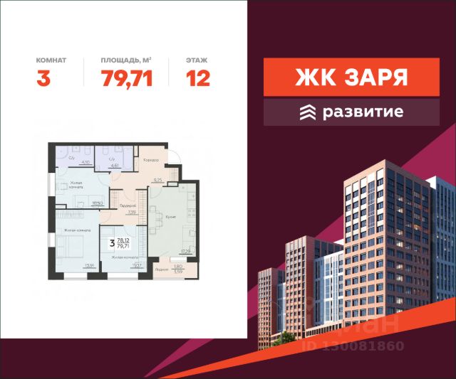 В продаже квартира площадью 79.71 кв. м с черновой отделкой. Квартира расположена на 12 этаже 14 этажного дома, в новом жилом комплексе "Заря" от федерального застройщика "Развитие". Жилой Комплекс "Заря" - это стильный, комфортный и современный проект с уникальной для Воронежа инфраструктурой. Между зданиями уютно расположится приватный благоустроенный двор-патио - мини оазис с пешеходными дорожками. Все это дополняет отличная транспортная доступность, неординарная архитектура, множество эксклюзивных форматов жилья, собственный подземный паркинг на 240 мест. "Заря" - новый стандарт комфортной городской жизни. Расположение Пешком: - 5 минут до ТЦ "Европа"; - 6 минут до остановки "Улица Брусилова"; - 7 минут до ул. Ильича; - 10 мин. до Ленинского проспекта. На машине: - 3 мин. до Чернавского моста; - 5 мин. до СК "Чернавская дамба" - 6 мин. до парка "Алые паруса"; - 7-10 минут до центра города и Петровской набережной. Благоустройство - стильное лобби с авторским дизайном; - теплая зона ожидания; - вместительные колясочные и велосипедные помещения; - лифты с доступом в паркинг; - кладовые на каждом этаже; - приватный двор-патио; - камерные лаунж-зоны в окружении зелени; - большое разнообразие растений: клены, ивы, можжевельник, китайская сирень и другие; - умное зонирование: тихие и шумные площадки удалены друг от друга; - беговые, прогулочные, велосипедные дорожки; - площадки для малышей и подростков; - спортивные корты и тренажеры; - общественный променад с ритейлом; - собственный деловой центр; - кафе, творческие студии, спортивные секции и магазины прямо на первом этаже дома. Окружение - места для прогулок: парк Патриотов, парк и пляж "Алые Паруса", сквер Ильича, бульвар "Ленинский проспект" у Воронежского водохранилища; - активный отдых: яхт-клуб, Центральный стадион, спорткомплекс Platinum Arena, фитнес-центр "Олимп" с бассейном; - все нужное рядом: ТЦ "Европа", школы и детские сады, поликлиника, центр педиатрии; - близость к центру: Центральный парк, Воронежский концертный зал, здание Управления ЮВЖД, Благовещенский собор.