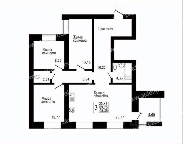 • Трёхкомнатная, расположена на 2 этаже 5-этажного кирпичного дома;