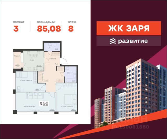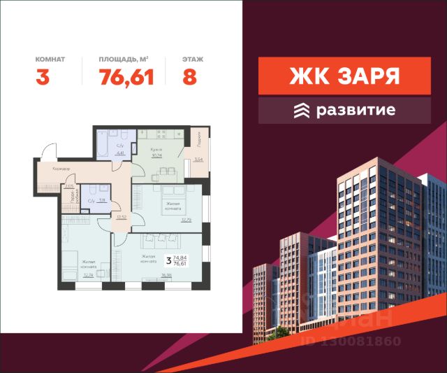 Продаётся 3-комнатная квартира в строящемся доме (Позиция 38), срок сдачи: III-кв. 2026, общей площадью 75.9 кв.м., на 8 этаже. Расположение, транспортная доступность