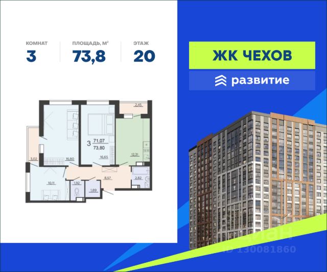 Продается квартира площадью 76.91 кв. м без отделки. Квартира находится на 18 этаже 20 этажного дома, в жилом комплексе "Чехов". Комплекс расположен по адресу - г. Воронеж, ул. Богдана Хмельницкого д. 45а. ЖК "Чехов" - новый проект ГК "Развитие" в Железнодорожном районе. Это современный жилой дом, состоящий из 4 секций с закрытым от шума собственным двором-"полумесяцем", где будет безопасно отпустить ребенка на прогулку и оставить автомобиль на ночь. Это проект для тех, кто ценит удобство и функциональность жилья, кто хочет получить максимальный комфорт за разумную цену. Расположение Пешком: - 4 мин. до автобусной остановки "Мебель Черноземья"; - 15 мин. до Суворовского затона; - 20 мин. до пляжа у Воронежского водохранилища. На автомобиле: - 2 мин. до Ленинского проспекта; - 5 мин. до ж/д станции "Отрожка"; - 15 мин. до центра города; - 20 мин. до вокзала "Воронеж-Южный". Благоустройство - большой озелененный двор; - умное зонирование; - взрослые деревья и живые цветы; - площадки для детей всех возрастов; - развивающий комплекс для самых маленьких; - зоны для фотосессий, особенно интересные подросткам; - спортивные конструкции и тренажеры; - безопасное покрытие на активных площадках; - собственный вишневый сад; - прогулочные и велосипедные дорожки; - отдельная стоянка для машин; - ритейл на первых этажах: рестораны, продуктовые лавки, службы быта. Окружение - 10 образовательных учреждений: школы, детские сады, колледжи, ВУЗы; - торгово-развлекательные центры "Максимир", "Лазурный", "Depo"; - 3 фитнес-центра, гребная база и стадион "Локомотив"; - пляж у Голубого озера, Репнинский лес, Центральный парк, Помологический сад ВГАУ и множество других парковых зон в центре города.