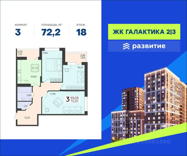 В продаже квартира площадью 72.20 кв. м с черновой отделкой. Квартира расположена на 18 этаже 18 этажного дома, в жилом комплексе комфорт-класса "Галактика 2|3". "Галактика 2|3" - это современный квартал нового поколения, где есть все городские удобства, дополненные локациями для активного отдыха, а главное -близостью к природе. Здесь вас будут ждать уютные квартиры с панорамными балконами и большие дворы с детскими площадками. Проект реализован группой компаний "Развитие" - один из крупнейших девелоперов Воронежской области, занимающий лидирующую позицию среди застройщиков по объему текущего строительства. Расположение Пешком: - 5 мин. до улицы Независимости; - 5 мин. до остановки "СКС Лада"; - 15 мин. до Северного леса; - 20 мин. до ТРК "Арена". На автомобиле: - 5 мин. до трассы на ул. Антонова-Овсеенко; - 10 мин. до Московского проспекта; - 15 мин. до Центрального парка; - 20 мин. до набережной Максима Горького. Благоустройство - двор, разделенный на функциональные зоны; - ландшафтное озеленение; - тихие уголки для отдыха; - скамьи и садовая мебель; - каменные дорожки для прогулок; - велосипедные и беговые дорожки; - большой игровой кластер для подростков; - активная площадка для малышей; - workout-тренажеры; - безопасное мягкое покрытие; - освещение в темное время суток; - большая открытая парковка; - кладовые для хранения велосипедов или лыж; - коммерческие офисы с ресторанами, магазинами и кафе. Окружение - жизнь по соседству с природой: Северный лес, озёра Бычок, Северск и Круглое, Фигурная роща, река Дон; - спортивные объекты: спорткомплекс "Арена Север", стадионы "Воронеж-Ринг", "Мир футбола", "Атлант", конный клуб "Старица", "Олимпик", ТРЦ Сити-парк "ГРАД"; - культурный отдых: музей ВДВ в парке Победы, Археологический музей, культурный центр "Северный"; - ТРЦ "Арена", "Московский проспект", школы, детские сады, супермаркеты.