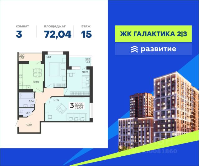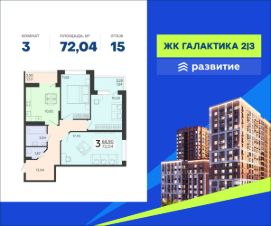 В продаже квартира площадью 70.67 кв. м с черновой отделкой. Квартира расположена на 22 этаже 22 этажного дома, в жилом комплексе комфорт-класса "Галактика 2|3". "Галактика 2|3" - это современный квартал нового поколения, где есть все городские удобства, дополненные локациями для активного отдыха, а главное -близостью к природе. Здесь вас будут ждать уютные квартиры с панорамными балконами и большие дворы с детскими площадками. Проект реализован федеральным застройщиком "Развитие" - один из крупнейших девелоперов Воронежской области, занимающий лидирующую позицию среди застройщиков по объему текущего строительства. Расположение Пешком: - 5 мин. до улицы Независимости; - 5 мин. до остановки "СКС Лада"; - 15 мин. до Северного леса; - 20 мин. до ТРК "Арена". На автомобиле: - 5 мин. до трассы на ул. Антонова-Овсеенко; - 10 мин. до Московского проспекта; - 15 мин. до Центрального парка; - 20 мин. до набережной Максима Горького. Благоустройство - двор, разделенный на функциональные зоны; - ландшафтное озеленение; - тихие уголки для отдыха; - скамьи и садовая мебель; - каменные дорожки для прогулок; - велосипедные и беговые дорожки; - большой игровой кластер для подростков; - активная площадка для малышей; - workout-тренажеры; - безопасное мягкое покрытие; - освещение в темное время суток; - большая открытая парковка; - кладовые для хранения велосипедов или лыж; - коммерческие офисы с ресторанами, магазинами и кафе. Окружение - жизнь по соседству с природой: Северный лес, озёра Бычок, Северск и Круглое, Фигурная роща, река Дон; - спортивные объекты: спорткомплекс "Арена Север", стадионы "Воронеж-Ринг", "Мир футбола", "Атлант", конный клуб "Старица", "Олимпик", ТРЦ Сити-парк "ГРАД"; - культурный отдых: музей ВДВ в парке Победы, Археологический музей, культурный центр "Северный"; - ТРЦ "Арена", "Московский проспект", школы, детские сады, супермаркеты.