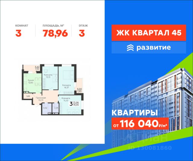 В продаже квартира площадью 65.60 кв. м с черновой отделкой. Квартира расположена на 12 этаже 16 этажного дома, в жилом комплексе комфорт-класса "Квартал 45". "Квартал 45" - это амбициозный проект будущего сердца Московского проспекта, в котором объединены лучшие градостроительные традиции, уникальная архитектура и современные технологии дизайна. Удачная локация рядом с центром, функциональные планировки, приватный парк в шаге от дома, собственный подземный паркинг на 187 машино-мест. Проект от федерального застройщика "Развитие" сочетает в себе все преимущества современного комфортного жилья. Расположение Пешком: - 3 мин. до остановки "Московский проспект"; - 5 мин. до Центрального автовокзала; - 15 мин. до уютного Коминтерновского сквера. На автомобиле: - 10 мин. до центра Воронежа; - 10 мин. до Ботанического сада; - 15 мин. до Петровской набережной. Благоустройство - приватный двор для жителей; - безопасность: нет машин, работают видеокамеры; - много зелени: деревья, кустарники, газоны; - тихие места для отдыха на свежем воздухе; - спортивный корт для командных игр; - силовые тренажеры и турники; - игровой городок для детей всех возрастов; - лужайки для пикников; - велосипедные и беговые дорожки; - длинный прогулочный бульвар; - просторный холл с авторским дизайном; - 2 лифта в каждом подъезде - грузовой и пассажирский; - удобные зоны хранения колясок и спортивного инвентаря; - кафе, продуктовые магазины, салоны красоты и другая инфраструктура на первом этаже дома. Окружение - 5 парков в пределах 10 минут: Центральный парк, Ботанический сад ВГУ, Лесопарковый участок НИИЛГиС, парк Победы, Северный лес; - спорткомплекс и стадион "Динамо", "Арена Север", Центральный стадион профсоюзов; - детская и взрослая областная больница, несколько частных клиник; - ТРЦ "Московский проспект", ТЦ "Москва", множество сетевых супермаркетов. Купить 3-комнатную квартиру на улице 45-й Стрелковой Дивизии в городе Воронеж.
