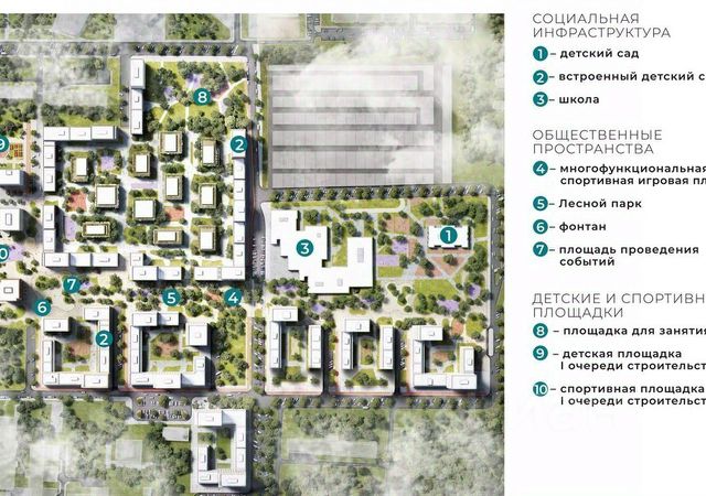 Пространство жилого комплекса представляет собой настоящий "город-сад" и будет состоять из нескольких кварталов-садов: Яблоневый, Еловый, Дубовый, Сиреневый, Кедровый, Ягодный, Цветочный, Березовый и Абрикосовый. На создание такой концепции создателей вдохновили уже существующие ландшафты и деревья. В зимние месяцы жителей квартала будут радовать вечнозеленые хвойные деревья и кустарники, весной — цветущие яблони, абрикосы, сирень, летом — злаковые растения, травы и цветы. А осень подарит удивительные краски и эффектное цветение многолетников. В распоряжении жителей проекта будет парк "Лесной", включающий в себя общественные пространства, детские, спортивные площадки