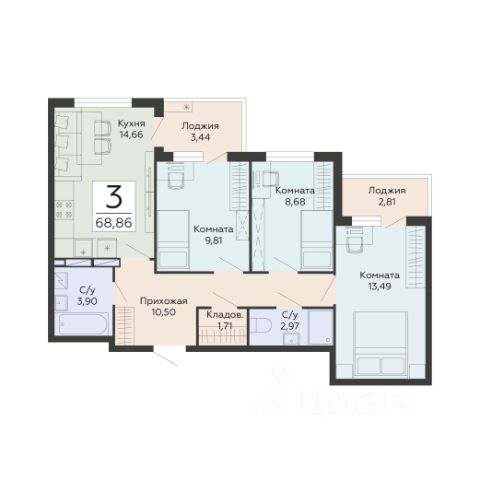 Продаётся 3-комнатная квартира в строящемся доме (1 этап), срок сдачи: IV-кв. 2029, общей площадью 68.86 кв.м., на 9 этаже. Новый жилой комплекс от группы компаний "Развитие" расположен по адресу: г. Воронеж, по ул. Туполева.