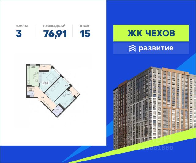 Продается квартира площадью 76.91 кв. м без отделки. Квартира находится на 15 этаже 20 этажного дома, в жилом комплексе "Чехов". Комплекс расположен по адресу - г. Воронеж, ул. Богдана Хмельницкого д. 45а. ЖК "Чехов" - новый проект ГК "Развитие" в Железнодорожном районе. Это современный жилой дом, состоящий из 4 секций с закрытым от шума собственным двором-"полумесяцем", где будет безопасно отпустить ребенка на прогулку и оставить автомобиль на ночь. Это проект для тех, кто ценит удобство и функциональность жилья, кто хочет получить максимальный комфорт за разумную цену. Расположение Пешком: - 4 мин. до автобусной остановки "Мебель Черноземья"; - 15 мин. до Суворовского затона; - 20 мин. до пляжа у Воронежского водохранилища. На автомобиле: - 2 мин. до Ленинского проспекта; - 5 мин. до ж/д станции "Отрожка"; - 15 мин. до центра города; - 20 мин. до вокзала "Воронеж-Южный". Благоустройство - большой озелененный двор; - умное зонирование; - взрослые деревья и живые цветы; - площадки для детей всех возрастов; - развивающий комплекс для самых маленьких; - зоны для фотосессий, особенно интересные подросткам; - спортивные конструкции и тренажеры; - безопасное покрытие на активных площадках; - собственный вишневый сад; - прогулочные и велосипедные дорожки; - отдельная стоянка для машин; - ритейл на первых этажах: рестораны, продуктовые лавки, службы быта. Окружение - 10 образовательных учреждений: школы, детские сады, колледжи, ВУЗы; - торгово-развлекательные центры "Максимир", "Лазурный", "Depo"; - 3 фитнес-центра, гребная база и стадион "Локомотив"; - пляж у Голубого озера, Репнинский лес, Центральный парк, Помологический сад ВГАУ и множество других парковых зон в центре города.