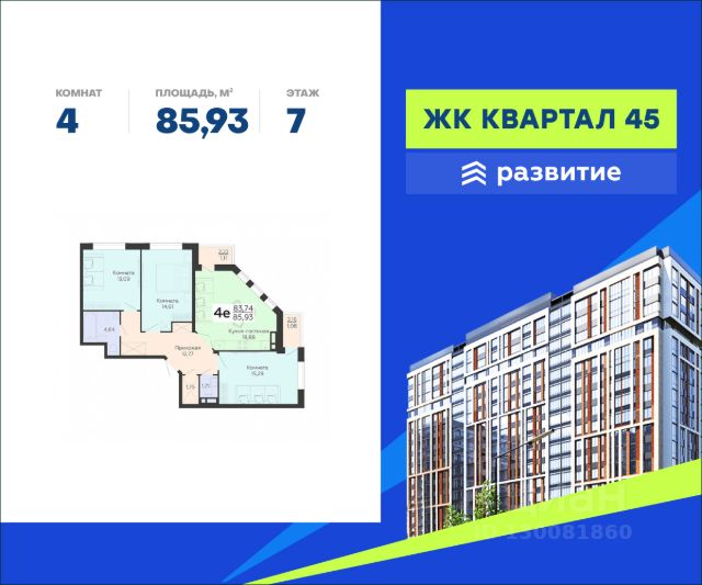 В продаже квартира площадью 85.93 кв. м с черновой отделкой отделкой. Квартира расположена на 7 этаже 18 этажного дома, в жилом комплексе комфорт-класса "Квартал 45". "Квартал 45" - это амбициозный проект будущего сердца Московского проспекта, в котором объединены лучшие градостроительные традиции, уникальная архитектура и современные технологии дизайна. Удачная локация рядом с центром, функциональные планировки, приватный парк в шаге от дома, собственный подземный паркинг на 187 машино-мест. Проект от девелопера "Развитие" сочетает в себе все преимущества современного комфортного жилья. Расположение Пешком: - 3 мин. до остановки "Московский проспект"; - 5 мин. до Центрального автовокзала; - 15 мин. до уютного Коминтерновского сквера. На автомобиле: - 10 мин. до центра Воронежа; - 10 мин. до Ботанического сада; - 15 мин. до Петровской набережной. Благоустройство - приватный двор для жителей; - безопасность: нет машин, работают видеокамеры; - много зелени: деревья, кустарники, газоны; - тихие места для отдыха на свежем воздухе; - спортивный корт для командных игр; - силовые тренажеры и турники; - игровой городок для детей всех возрастов; - лужайки для пикников; - велосипедные и беговые дорожки; - длинный прогулочный бульвар; - просторный холл с авторским дизайном; - 2 лифта в каждом подъезде - грузовой и пассажирский; - удобные зоны хранения колясок и спортивного инвентаря; - кафе, продуктовые магазины, салоны красоты и другая инфраструктура на первом этаже дома. Окружение - 5 парков в пределах 10 минут: Центральный парк, Ботанический сад ВГУ, Лесопарковый участок НИИЛГиС, парк Победы, Северный лес; - спорткомплекс и стадион "Динамо", "Арена Север", Центральный стадион профсоюзов; - детская и взрослая областная больница, несколько частных клиник; - ТРЦ "Московский проспект", ТЦ "Москва", множество сетевых супермаркетов.