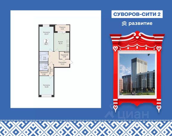 Жилой комплекс "Суворов Сити II" — продолжение современного масштабного проекта "Суворов Сити", находящегося в спальном районе в четырех километрах от центра города. Проект сочетает удачное расположение с удобными планировками, актуальным дизайном и приватным двором. Расположение Пешком: — 510 минут Автобусные остановки; — 12 минут Школа 50; — 15 минут Детский сад 174; — 20 минут ТРЦ "Армада". На автомобиле: — 1 минута улица Матросова; — 5 минут улица Ворошилова, проспект Патриотов; — 10 минут Вогрэсовский мост; — 15 минут проспект Революции, Чернавский мост, вокзал "Воронеж-1"; — 30 минут выезд на М-4; — 50 минут аэропорт "Воронеж". Лобби — Колясочная; — Лапомойка для питомцев; — Входные группы с окнами в пол; — Лифты с возможностью спуска в подземный паркинг на 465 машиномест. Благоустройство — Двор закрыт от прохожих и транспорта; — Доступ на внутреннюю территорию, в парадные и в паркинг по ключам; — Круглосуточное видеонаблюдение; — Собственная инфраструктура (важные магазины и сервисы) на первом этаже здания; — Детский сад во дворе ЖК; — Пешеходная аллея; — Места для отдыха со скамейками и перголами; — Детские игровые и спортивные площадки; — Навигационная подсветка в темное время суток. Окружение — Спокойный спальный район; — Близко магазины, кафе, медклиник, салонов красоты, аптек; — В шаговой доступности скверы, сады, ТРЦ, стадион. О застройщике Федеральный застройщик ГК "Развитие" лидирует по количеству возводимых объектов и входит в ТОП-20 девелоперов России. За 10 лет на рынке компания ввела в эксплуатацию свыше 700 тыс. кв. м жилья, еще столько же находится в стадии строительства. В портфеле — 30 завершенных проектов и более десятка тысяч заселенных квартир. Девелопер сотрудничает с ведущими отраслевыми партнерами, включая "Северсталь" и "Технониколь". "Развитие" специализируется на строительстве жилых комплексов и микрорайонов, развитии инфраструктуры и создании комфортной городской среды. Девелопер реализует проекты в Воронеже, Москве и области, Ленинградской области, Крыму, Орле и Самаре. Основные форматы — ЖК комфорт- и бизнес-класса, апарт-отели, прибрежные премиальные комплексы и жилые кластеры с коммерцией, парковками и благоустроенными дворами.