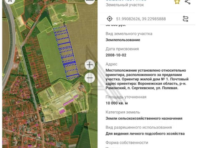 Размер 30х50м ровный, растет 2сосны, земляника. ул.Веселая. Улицы широкие (уникальное явление): - Спереди -25м, сзади -14м, сбоку -5м проезд. - Газ, - Свет, спереди или сзади по улицам, электро-столбы у 3х углов. - Вода -башня рядом сбоку. Если поделить на 4 части (до размера как в некоторых поселках), то заезд и коммуникации будут удобно расположены с двух улиц (можно проехать насквозь). С соседями граница с 1 стороны. Справа проезд -5м, и участок водонапорной башни с соснами на 39сот. Слева пустые участки, территория сельхозпарка. Грунт не завозной-естественного уплотнения. Территория никогда не заливалась. Самолеты рядом не летают. Улицы не в частной собственности. Дороги федерального и регионального значения рядом, поэтому проезд возможен в любую непогоду. Поселок развитый, есть все учреждения, характерные для райцентров, +достопримечательности и места ежегодных фестивалей, река, родник. Одинаково удобен как для ИЖС, так и бизнеса. На сегодня проезд только через ул. Шелестова, ориентир водонапорная Башня. Границы участка около столбов, чуть левее, фото 2. Предложение актуально, пока в продаже есть интересующий нас объект. По расстоянию от Воронежа (круг туда-обратно) сравнимо, как и до большинства сёл в этой округе: Староживотинное, Медовка, Моховатка, Чертовицы, Новоподклетное, Ямное. КП: Снегири, Раменки, Тихий Дон, Колизей, Кольцово, Заповедный, Белые Росы, Приозерный, Зеленый Яр, Самоцветы, Изумрудный ,Раздолье и др.