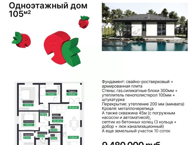 В продаже последний одноэтажный жилой ДОМ площадью 105м2 с террасой в КОТТЕДЖНОМ ПОСЕЛКЕ ИЗУМРУДНЫЙ по улице ЯНТАРНАЯ расположенный на участке 6 соток Если ВЫ мечтаете о СОБСТВЕННОМ ЗАГОРОДНОМ ДОМЕ , то вы попали точно по адресу Успевайте!!! Льготный условия по семейной ипотеке до 1 февраля 2026г !!! Строительная компания КАПИТАЛ СТРОЙ осуществляем СТРОИТЕЛЬСТВО НЕ типовых частных домов ПРОДАЖА ОТ ЮРИДИЧЕСКОГО ЛИЦА !!!! БЫСТРЫЙ ВЫХОД НА СДЕЛКУ !!! ВСЕ ДОКУМЕНТЫ ГОТОВЫ !!! ПОЛНОЕ СОПРОВОЖДЕНИЕ СДЕЛКИ!!! Дом с отличной практичной современной планировкой, с ТРЕМЯ спальнями - 2 детские + мастер-спальня, двумя просторными совмещенными санузлами. Гостиная совмещенная с кухней и столовой, с возможностью зонирования, расположена на площади 36м2, с выходом на террасу, также имеется отдельное помещение (оно же котельная) для хозяйственных нужд и отдельная гардеробная комната. Все инженерные коммуникации (газ, вода, электроэнергия) заведены в дом и подключены к центральным сетям. Канализация - выгребная яма. Индивидуальное отопление представлено водяными теплыми полами по ВСЕЙ площади дома, осуществляемое двухконтурным газовым котлом. Предчистовая отделка помещений представлена ровной сухопрессованной стяжкой пола и механизированной штукатуркой стен !! ПОСПЕШИТЕ приобрести собственный райский уголок в дали от суеты городского шума!! ЗВОНИТЕ , пишите , ждем вас на просмотры!!! не откладывайте реализацию своей мечты на завтра Коттедж, кол во спален - 1..