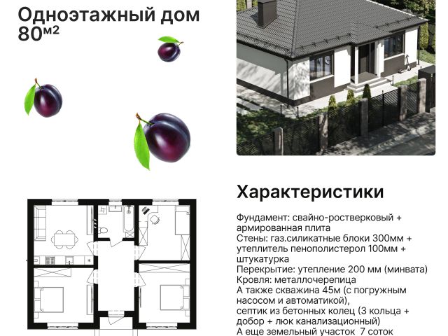 Продаётся одноэтажный дом 105 м² с террасой в КП Земляничный 3 спальни + большая кухня-гостиная + 2 санузла + гардероб + терраса Посадка дома выполнена на участке 10 соток. ИЖС с городской инфраструктурой в 3 км от Воронежа. Адрес: Воронежская область, Хохольский район, п. Новогремяченское, коттеджный посёлок Земляничный. _______________________________ Дом в предчистовой отделке (white box): - Разводка электрики по дому (розетки/выводы под свет) - Разводка сантехники под мокрые точки - Отопление с двухконтурным газовым котлом 24 кВт и радиаторами - Штукатурка стен под обои/покраску - Черновая стяжка пола под финиш - Люк с раскладной лестницей на чердак - Входная дверь - Окна Rehau 70 мм, двухкамерные, тройной стеклопакет _______________________________ Участок и инженерия: - Фундамент: свайно-ростверковый + армированная плита - Стены: газ.силикатные блоки 300 мм + утеплитель Пенополистирол 100 мм + штукатурка - Перекрытие: утепление 200 мм (минвата) - Кровля: металлочерепица - Скважина 45 м (с погружным насосом и автоматикой) - Септик из бетонных колец (3 кольца + добор + люк канализационный) _______________________________ О поселке "Земляничный" Локация — на живописных холмах, среди полей, недалеко от реки Дон и леса. Для комфортной жизни предусмотрены элементы инфраструктуры и благоустройства: детские площадки, видеонаблюдение, скоростной интернет, школа и детский сад, новая поликлиника. В Земляничном можно не только купить участок, но и построить дом в едином стиле посёлка. Есть типовые проекты 65 / 80 / 90 / 105 / 115 / 130 м², либо строительство по вашему проекту с сохранением общей концепции. Планировку можно адаптировать: добавить розетки и свет, выводы под технику, скорректировать проёмы и размеры комнат. _______________________________ Ипотека — от 6%: доступны льготные программы, сельская ипотека, маткапитал и господдержка. Посёлок аккредитован в Сбербанке, ВТБ и ДОМ.РФ. Хотите купить готовый дом в КП Земляничный или забронировать участок под строительство? Звоните по номеру — подберём варианты под ваш бюджет, покажем планировки и сроки, и запишем на просмотр посёлка
