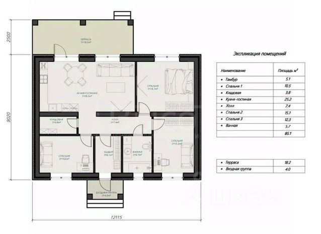 Общая площадь дома 115,4 м², высота потолков 3 м