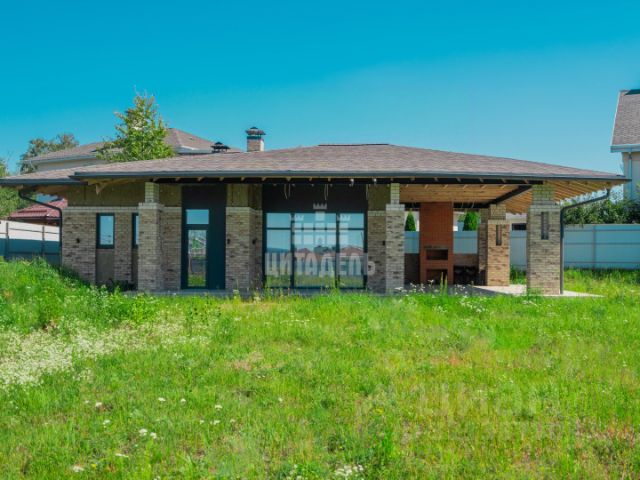 Фасад коттеджа выполнен из рустированного кирпича, природного и отделочного камня.