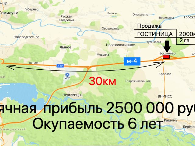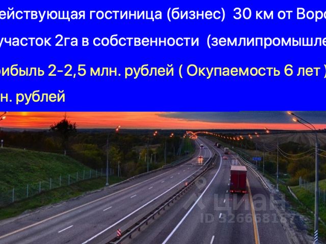 Продается готовый бизнес с быстрой окупаемостью 2 500 000 руб прибыль в месяц Вместе обсудим условия вашей покупки ЗВОНИТЕ Действующая Гостиница 2000 м/кв , Участок 2 га оформлен в собственность-землипромышленности Удобный асфальтированный въезд с трассы, большая авто-стояннка Благоустроенная асфальтированная территория. Стоянка на 50 автомобилей Летнее кафе, беседки, детская площадка Все центральные коммуникации. Собственная газовая котельная . 120 спальных мест ; 2-х3-х4-х5-ти местные, Люкс/Полулюкс много- и двух-, одно- местные.Современный ремонт, кондиционеры, интернет, Санузлы в номерах. Столовая. В цокольном этаже: Бассейн, сауна, Душ, санузел, комнаты отдыха. Пристройка 1 этаж: бытовые помещения для персонала , прачечная, столовая, ресепшн. Пожарная/охранная сигнализация. Собственная электроподстанция. Заполняемость номеров полностью, запись бронирования номеров за три месяца вперед. Вместе обсудим условия покупки ЗВОНИТЕ !!!!!!!!!! Продам гараж На улице 20-летия ВЛКСМ в городе Воронеж.